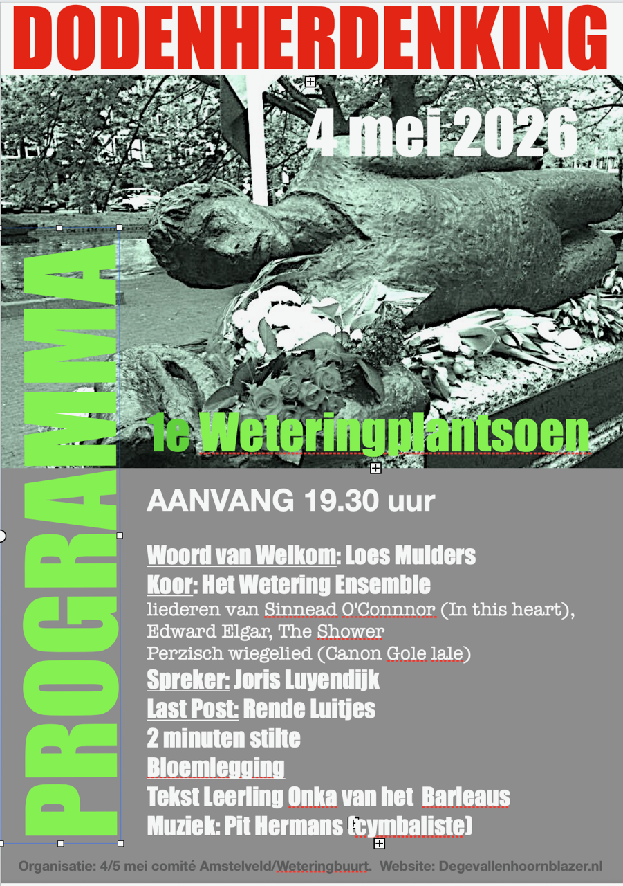 Het herdenkingsprogramma ziet er verder ls volgt uit: 19.35 uur Koor Wetering-ensemble zingt van Elgar They Are The Rest 19.38 uur Welkomswoord voorzitter 4/5 mei cie Loes Mulders 19.43 uur Koor Wetering Ensemble zingt The Silder Swan van Gibbons 19.45 uur Spreker Saskia Goldschmidt 19.55 uur Koor Wetering Ensemble zingt Ben Ali Libi van Willem Wilmink op muziek gezet door Theo van Lent. 19.58 uur The last Post door Rende Luitjes 20.00 uur Twee minuten stilte 20.02 uur Voordracht gedicht door Enza Cohen, leerling Barlaeus Gymnasium 20.03 uur Bloemlegging onder muzikale begeleiding van accordeonist Toni Smith en violist Vincent van Dam
